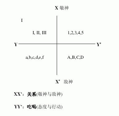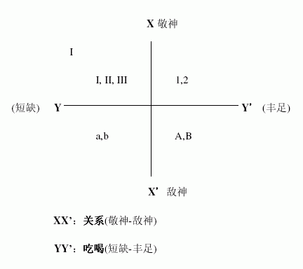 图六:「吃喝」(态度与行动)与关系(敬神或敌神)图